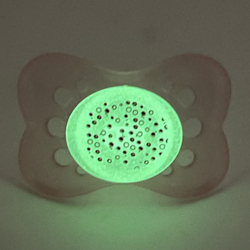 The pacifier is modeled after the natural shape of mom's nipple while breastfeeding. This makes for an easy transition from breast to pacifier and back. The asymmetrical nipple naturally fits baby's palate and allow a natural sucking motion, reducing pressure on teeth or jaw which helps prevent teeth misalignment. Shaped shaped shield fits perfectly under baby's nose which facilitate airflow so the baby will not get mouth sore or irritation from their own saliva between their mouth and shield. With a convenient glow-in-the-dark feature to help you find lost a pacifier during the night.