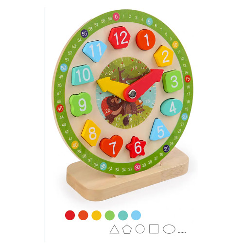 - Colourful wooden clock has geometric blocks of common shapes, and the shapes of the geometric blocks are all different, such as heart shape, triangle, pentagram, circle, square and so on. It is not difficult to imagine that the geometric blocks correspond to 12 time points. Children need to identify the shapes and the geometric blocks on the corresponding positions of the clock dial, which will greatly promote children's geometric thinking.