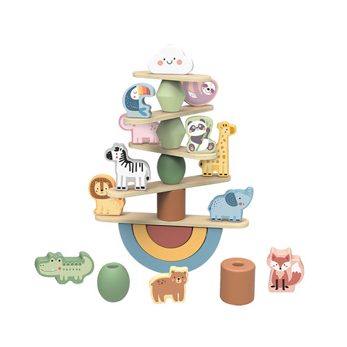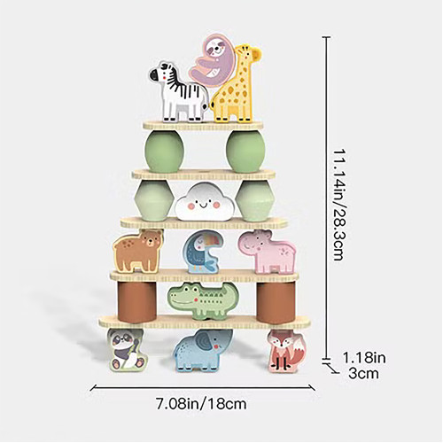 The Stacking Animals from Tooky Toy is an exciting and educational toy that promotes imaginative play and enhances fine motor skills. With lacing blocks, wood planks, and animal blocks, children can make animals climb up and stack them on top of rainbow blocks and sticks to keep them balanced and prevent them from falling off. This toy encourages children to use their visual and hands-on abilities, promoting their development in these areas. Overall, the Stacking Animals from Tooky Toy is a great toy for children who want to develop their fine motor skills and imagination while having fun. It encourages hands-on learning and exploration, while also providing a fun and exciting challenge to keep the animals stacked and balanced.