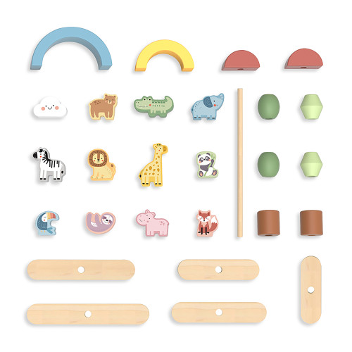 - The Stacking Animals set includes 5 wood planks, 1 wood stick, 6 lacing blocks, 11 animal blocks, 1 cloud, 3 rainbow blocks, 1 cloth bag, and an instruction manual.
