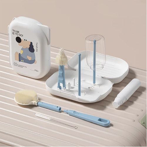 This handy baby bottle cleaning set includes extended wand, bottle brush, nipple brush, straw brush, 30ml soap dispenser, bottle drying rack and a container case. The brush set can clean your most baby accessories . It is very convenient when you travel outside!