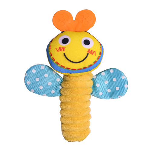 It is a sure to keep baby engaged rattle. It is made with soft premium fabric with developmental features that promote traditional play patterns, the squeak and sound is sized just right for baby's little hand.