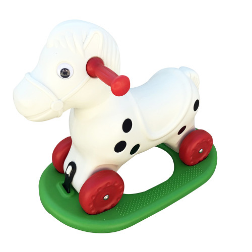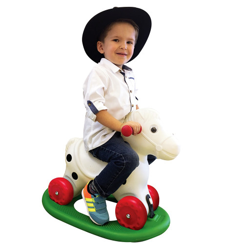 - This versatile ride on toy can rock back and forth on rockers, or the horse easily snaps off the rocker base to roll on bottom wheels. The ride-on toy can help your child develop strength and basic balance.