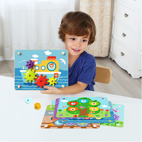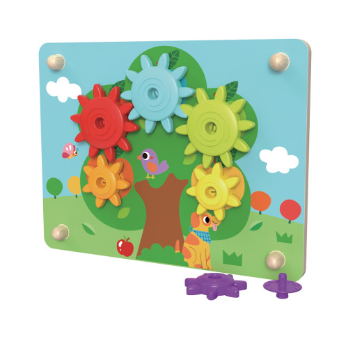 - 6 spinning cogs, 6 reversible pictures and a wooden pegboard mat.